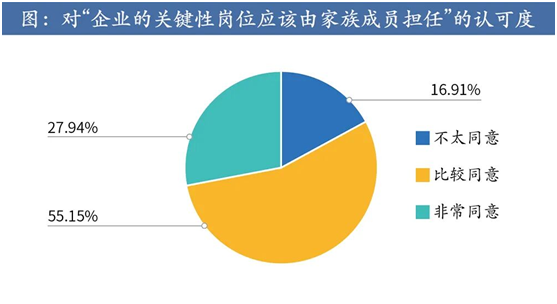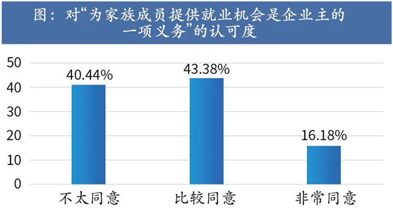 家族涉入“根植”于受访者思想中:59.56%的受访者认为其有义务为家族成员提供就业机会,83.09%的受访者认为企业的关键岗位应该有家族成员来担任。