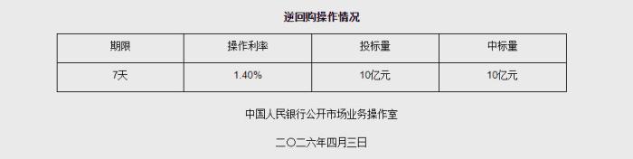 导读:中新网4月3日电 据央行网站消息,2026年4月3日中国人民银行以固定利率、数量招标方式开展了10亿元7天期逆回购操作,全额满足了一级交易商需求。具体情况如下: