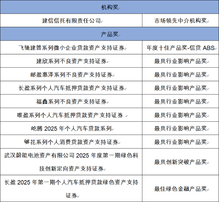 近日,建信信托凭借2025年度在资产证券化领域的突出表现,斩获“2025上证鹰·诚信托最佳资产证券化信托产品奖”以及第十届CNABS“金桂奖”年度评选中的12项大奖,充分体现了业界对于建信信托资产证券化业务的高度认可。