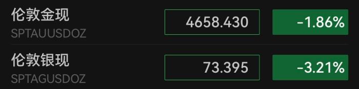 黄金白银则反向波动。截至北京时间7时34分,伦敦金现最低跌逾2%,跌破每盎司4650美元关口;伦敦银现一度跌超4%,最低报72.57美元/盎司。