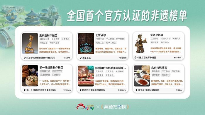 该榜单依托政府部门的权威资源与高德的真实数据,聚焦具有深厚文化底蕴、良好市场口碑的老字号和非遗代表性项目,推动传统文化“活”起来、“火”起来,让游客更好地感受北京非遗魅力,实现非遗品牌的创造性转化、创新性发展。