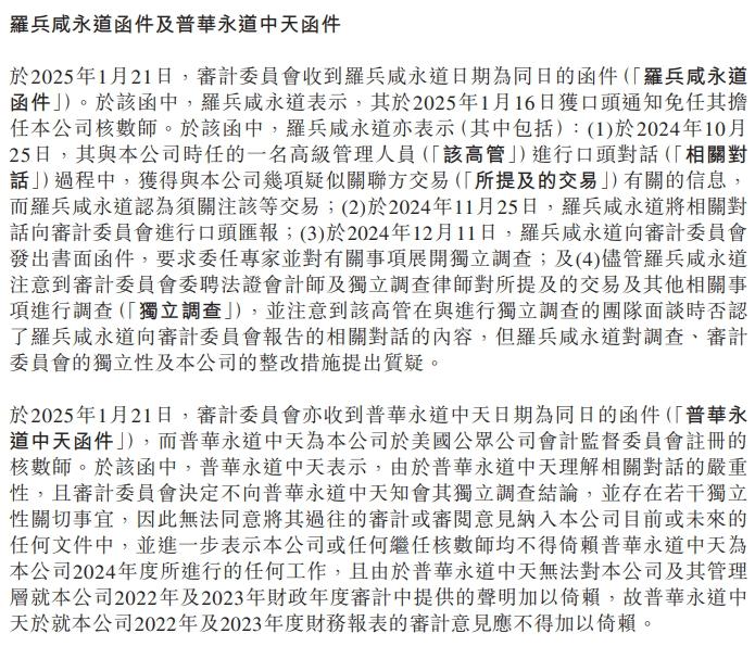 根据陆金所控股2025年1月发布的公告,2025年1月21日,公司审计委员会收到罗兵咸永道(普华永道香港别称)的函件。罗兵咸永道表示,其于2024年10月与陆金所控股时任的一名高管进行口头对话过程中,获得疑似关联方交易有关信息,在11月将相关对话向审计委员会进行口头汇报,并于12月向审计委员会发出书面函件,要求展开独立调查。