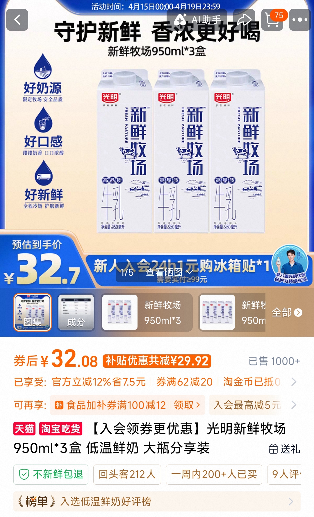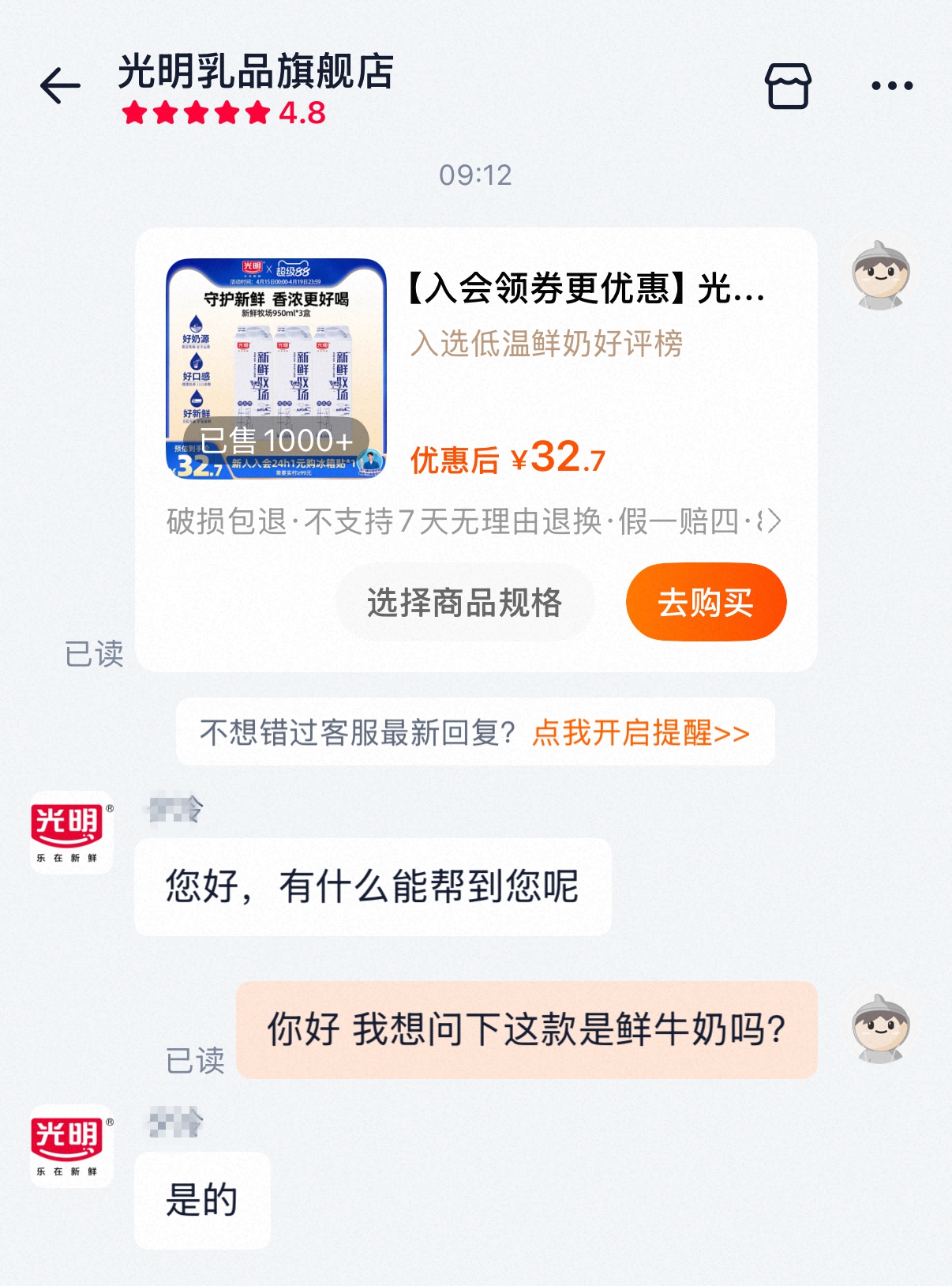 在电商平台上,不少网店对该款商品的介绍以“鲜奶”为宣传语,配料为生牛乳。当记者询问某电商平台上的光明乳品旗舰店客服该款牛奶是否为鲜牛奶时,对方明确表示,光明“新鲜牧场”牛奶为鲜牛奶。