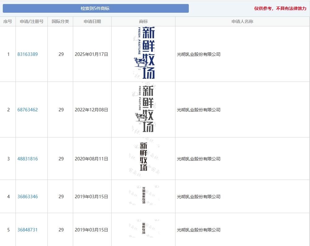 记者在国家知识产权局商标局网站搜索后发现,光明乳业股份有限公司曾多次申请“新鲜牧场”商标,但被驳回或不予受理后,目前无相关有效注册商标,仅以TM标识使用。