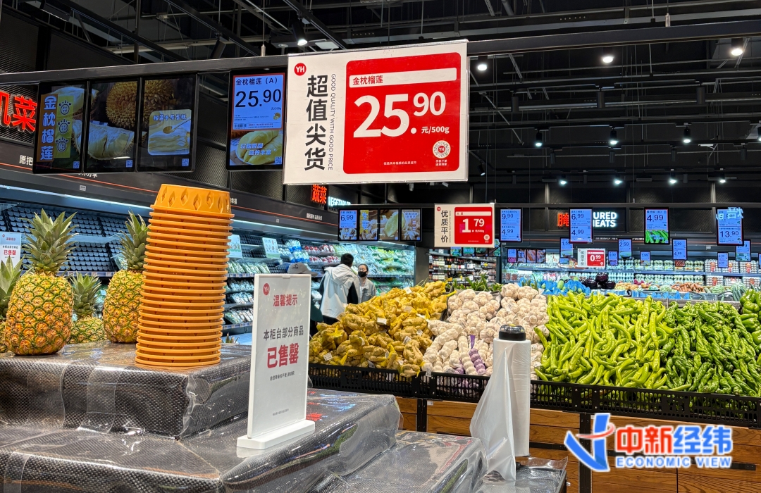 从零售端看,4月27日晚,中新经纬在北京市通州区某连锁超市内看到,金枕榴莲售价为25.9元/斤,但已售罄。
