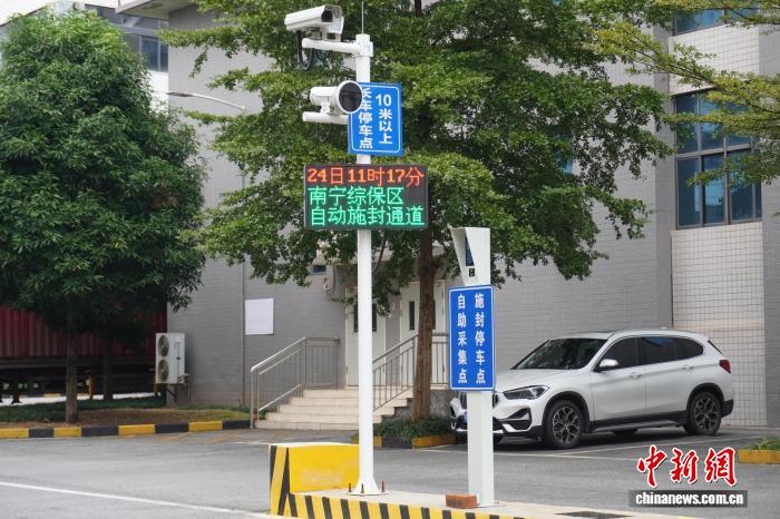 中新网南宁12月24日电 (姚北方 林洁琪)12月24日,一辆即将发往越南的货柜车从南宁综合保税区出发,在智能云卡口快速采集信息后,30秒内便完成智能施封,全程无人操作。