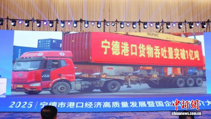 在宁德市三都澳港区漳湾作业区18-21号泊位,随着一箱集装箱货物稳稳地起吊装船,宁德港口货物吞吐量成功突破1亿吨。现场,各地政企代表汇聚一堂,视频连线,共同见证宁德迈入“亿吨大港”时代。