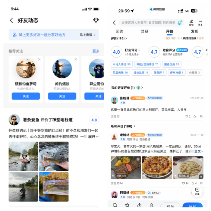 高德扫街榜创新引入基于信任关系的推荐机制,上线“好友动态”功能。用户浏览扫街榜时能优先看到好友对一家店的评分和评价,并第一时间看到好友公开发布的动态。此外,用户还能在扫街榜找到志趣相投的同好,查看他们的动态和评价,获取可信、专业的信息增量。