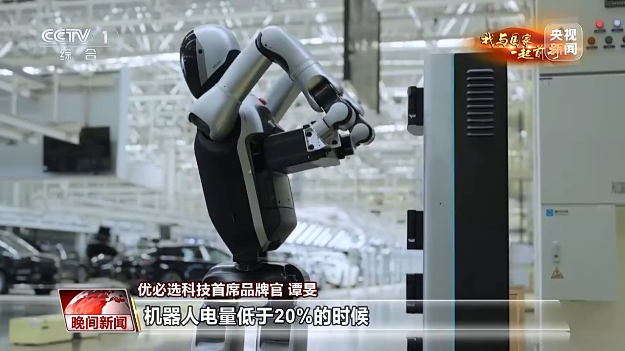 优必选科技首席品牌官 谭旻:机器人电量低于20%的时候,它就能够通过群体网络联网,找到工厂里面离它最近的一个充电桩,走过去进行三分钟之内的自主换电,从而实现24小时永不间断的新质生产力。