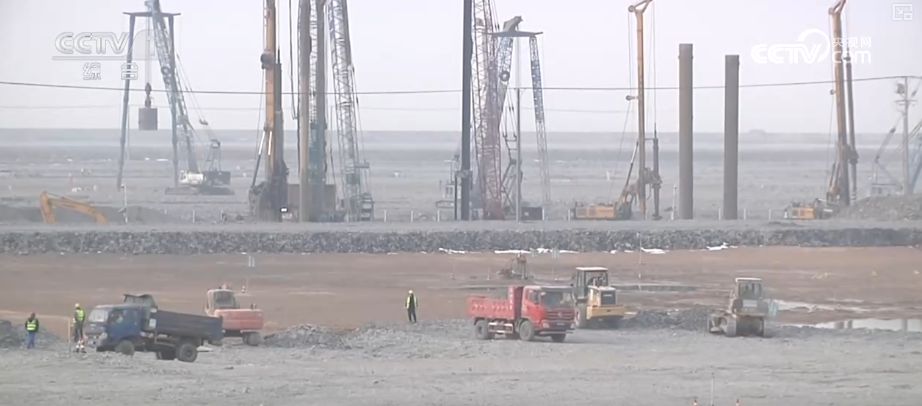 在大连金州湾国际机场施工现场,千余名建设者加速推进建设。这两天,机场填海主体工程顺利完工,累计形成了超20平方公里,相当于2800个标准足球场的坚实陆地。