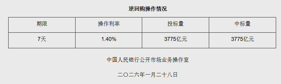 中新网1月28日电 据央行网站消息,2026年1月28日中国人民银行以固定利率、数量招标方式开展了3775亿元7天期逆回购操作。具体情况如下: