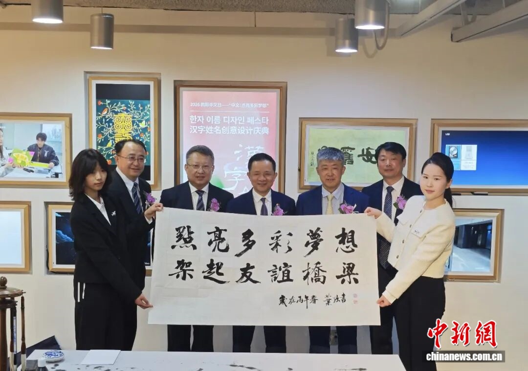 在热烈的氛围中,现场嘉宾共同为“2026国际中文日”系列活动剪彩,并举行了“汉字姓名创意设计”颁奖仪式。来自中国的著名书法家、韩国成均馆大学教授叶欣现场挥毫泼墨,书写“点亮多彩梦想,架起友谊桥梁”,引发现场嘉宾热烈反响。