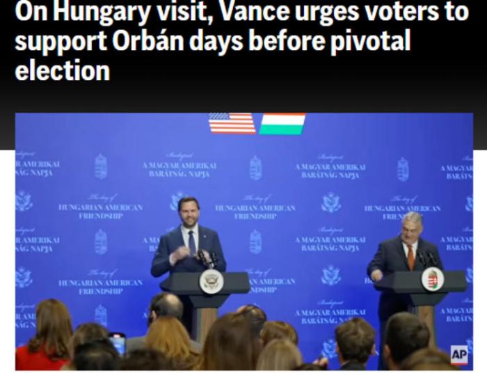 这是继3月21日美国总统特朗普在视频中,给予欧尔班“完全无条件支持”后,美国高层又一次重磅声援。这种赤裸裸的背书,在现代欧洲选举史上极为罕见。