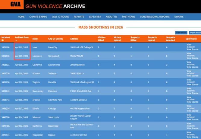仅4月19日一天,便有数起大规模枪击案发生。其中一起发生在当日凌晨爱荷华大学附近。此次事件造成5人受伤,其中3人为该校学生。