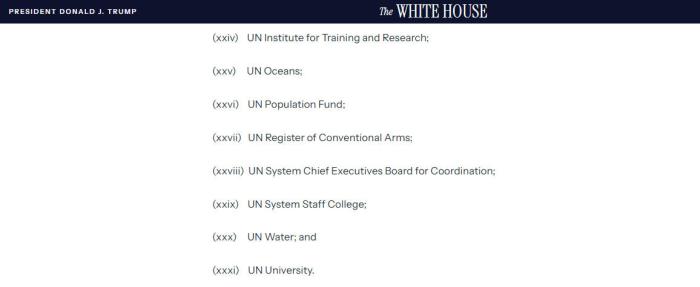 根据白宫声明,美国应退出的组织中,包括:联合国文明联盟;联合国贸易和发展会议;联合国人类住区规划署;联合国训练研究所;联合国气候变化框架公约;联合国经济及社会理事会非洲经济委员会;联合国经济及社会理事会——拉丁美洲及加勒比经济委员会;联合国大学;联合国人口基金等。