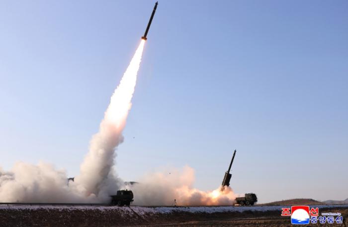 中新网1月28日电 据朝中社报道,当地时间27日,朝鲜导弹总局进行旨在验证运用新技术的更新型大口径火箭炮武器系统效力的试射。朝鲜劳动党总书记、国务委员长金正恩观摩了试射。