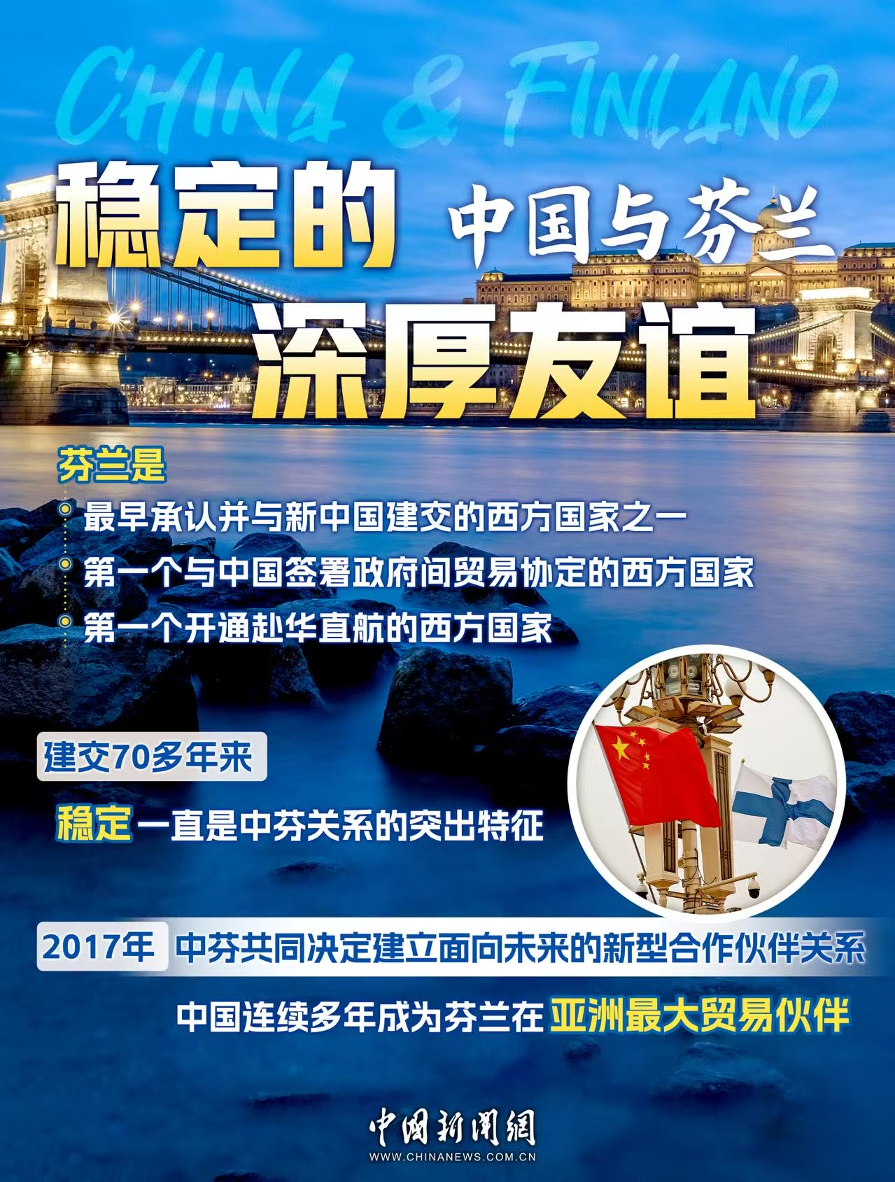 地处北欧的芬兰,是最早承认新中国的西方国家之一,当前中芬关系发展良好。中芬关系是不同历史文化、社会制度和发展阶段的国家间和平相处、互利合作的典范。
