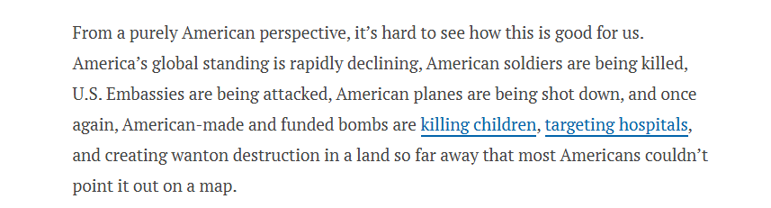 文章作者称,(美国)这场“无缘无故且非法的军事行为”已将地区拖入暴力升级的漩涡,导致数百名无辜平民丧生。即便从美国自身利益视角看,此举亦难言获益——美国全球地位正迅速下降,美军士兵不断伤亡,使馆与飞机遭袭,而美国制造或资助的炸弹仍在遥远土地上造成平民死伤与基础设施破坏。