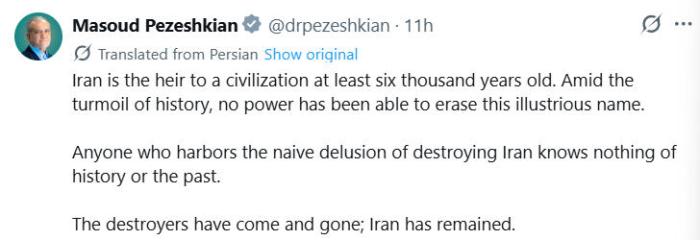导读:中新网3月11日电 综合外媒报道,伊朗总统佩泽希齐扬10日在社交媒体发文称,任何妄图摧毁伊朗的人都对历史一无所知,“侵略者来了又走,而伊朗始终屹立不倒”。