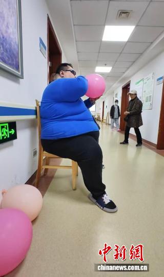 面对如此大体重、多病共存的患者,怎么为其安全减重?杨建军介绍,医院组织多学科会诊,为周先生定制了分阶段的治疗方案。营养科专家制定高蛋白、低糖、低脂的糖尿病饮食,将每天摄入的热卡控制在1500千卡以内,制造能量缺口的同时,医生为其用药控制血糖,抑制食欲,减轻体重。医生还为其佩戴无创呼吸机,提升血氧水平,通过利尿剂缓解其下肢浮肿、改善心肺功能。为了锻炼肺功能,医生让周先生每天上午下午各吹气球半小时。