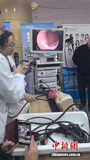 当日活动现场,科普讲解后,消化内科医生借助模型为民众演示胃镜和肠镜的检查过程。医生的演示吸引了众多民众。(完)