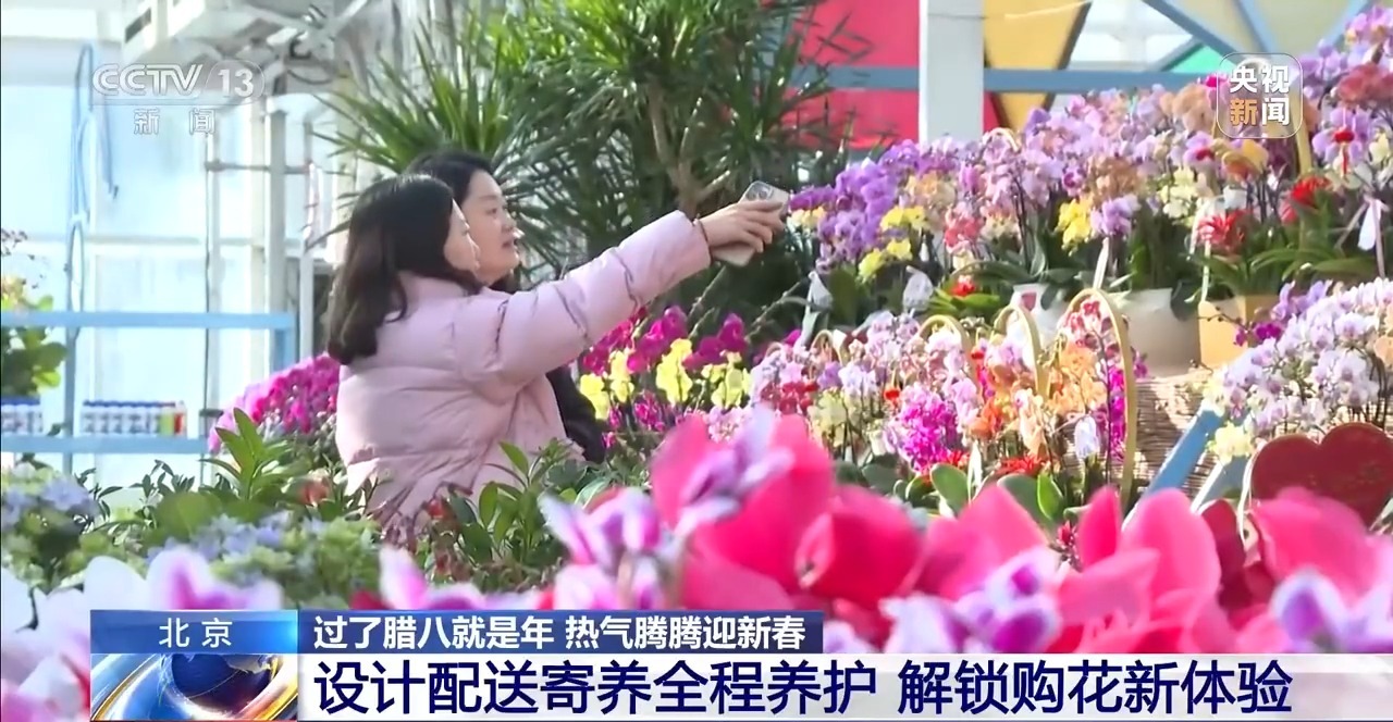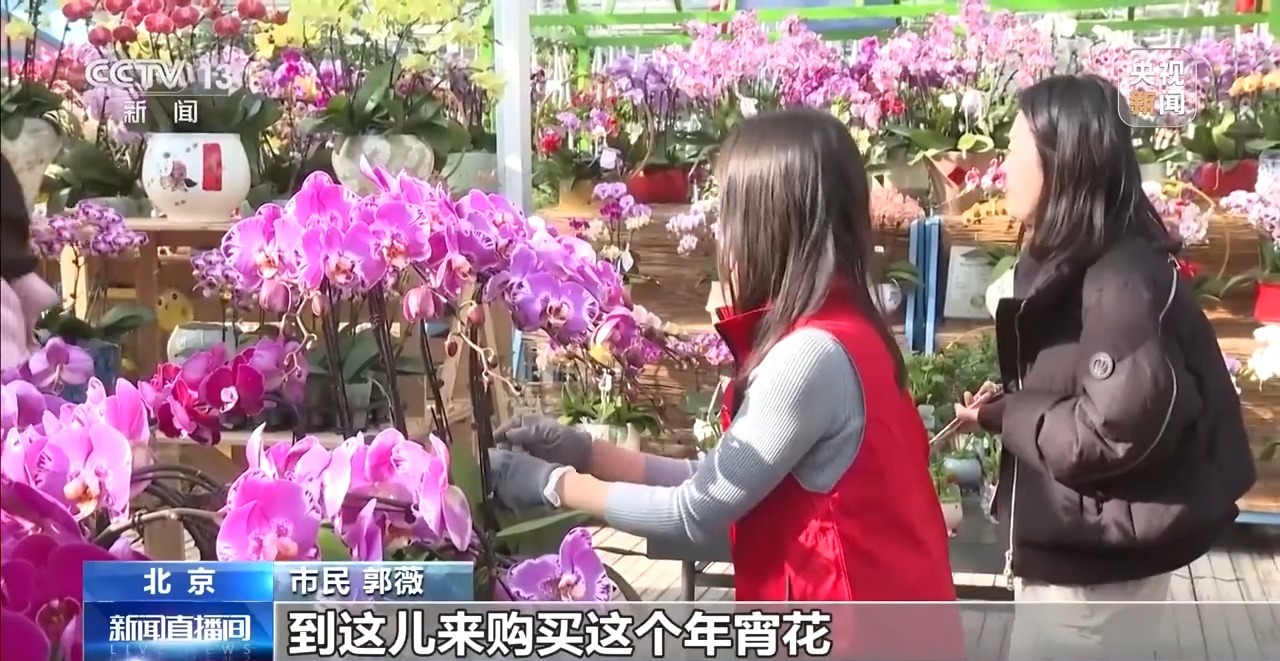 总台记者 马欣欣:我现在是在北京顺义区的北郎中花木中心的花卉展区,这里的年宵花种类丰富,开得正盛,还有很多市面上少见的新品种。北郎中花木中心是北京市重要的蝴蝶兰生产基地,一共有30多个蝴蝶兰品种。同时,这里还精心打造了场景化的绿植景观,市民们可以在购花的同时,感受到沉浸式的赏花氛围。