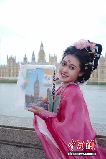 英国华威大学的中国留学生李田天一,身着汉服、手持英语课本,在大本钟前留下了特别的合影。为了这场打卡接力活动,她花了两三个小时精心做好全套汉服妆造,从考文垂市坐车一个半小时来到伦敦。