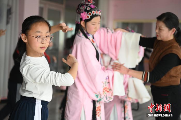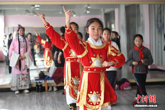 中新网兰州4月9日电 (戴文昌)婉转悠扬的唱腔回荡校园,一招一式的身段尽显神韵,铿锵有力的锣鼓点燃青少年热情……在甘肃省张掖市高台县解放街小学“戏曲社团”课堂上,非遗秦腔不再是戏台上的遥远艺术,而是扎根校园,让古戏唱新声走进孩子们的艺术世界。