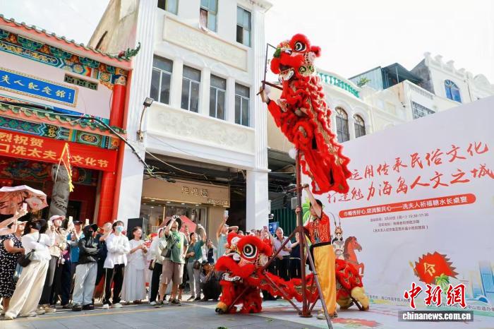 中新网海口3月31日电 (记者 张茜翼)30日下午,在海口骑楼老街得胜沙路,一张张长桌沿着街巷铺开,百余名民众并肩而坐。醒狮跃动,锣鼓声声,一碗碗糖水被端上桌来。一场以“巾帼传好心·甜润聚民心”为主题的冼夫人祈福糖水长桌宴,在这里温情开席。