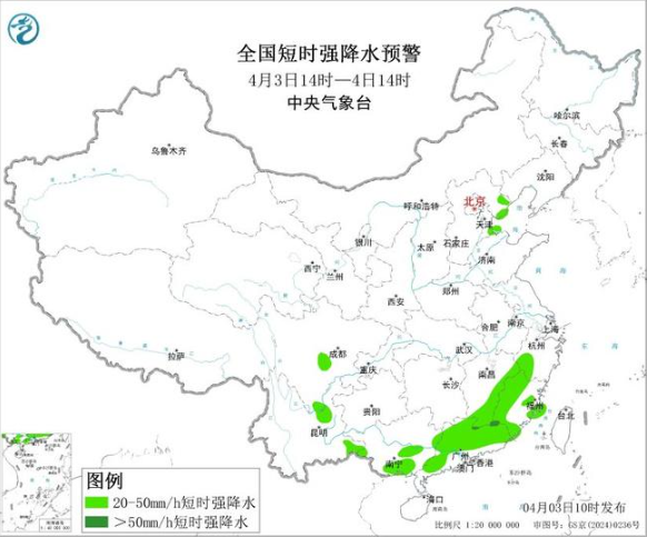 预计4月3日14时至4日14时,华北东部、东北地区南部、江南东部、华南中东部等地的部分地区将有8级以上雷暴大风或冰雹天气,其中,辽宁南部、河北东部、天津东部、山东北部、广西中南部、广东北部和西南部等地的部分地区将有10级以上雷暴大风,最大风力可达11级以上;华北东部、江南东南部、华南等地的部分地区将有小时雨量大于20毫米的短时强降水天气,其中,江西西南部、广东东北部等地的部分地区小时雨量大于50毫米。