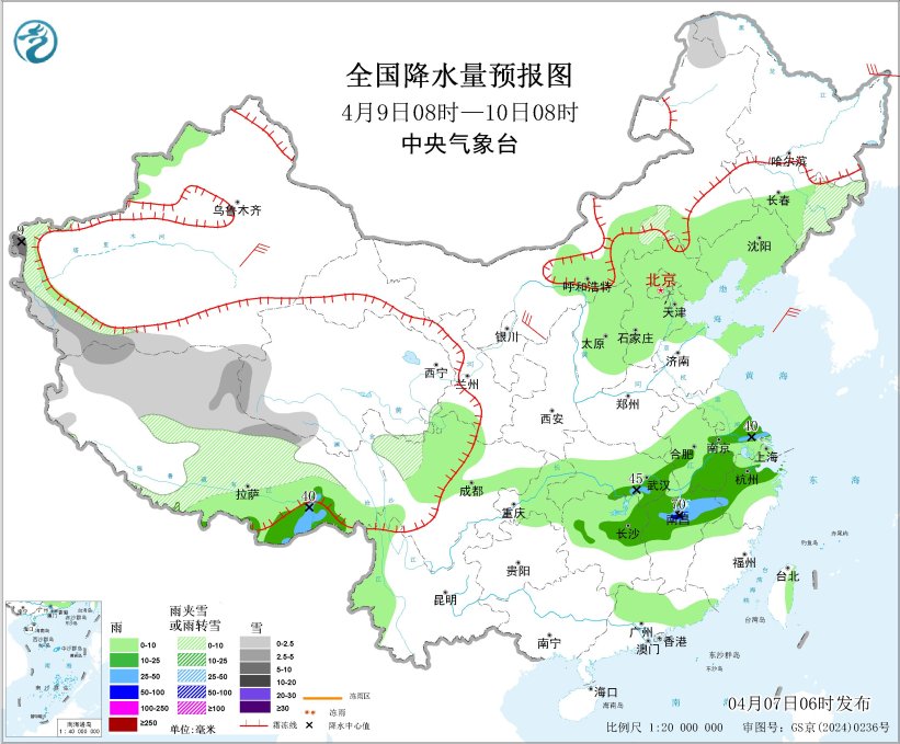 4月8日08时至9日08时,新疆南疆西部山区、西藏西南部和东部、青海南部、川西高原北部以及内蒙古中部等地部分地区有小到中雪或雨夹雪,其中,西藏西部局地有大到暴雪(10~15毫米);黄淮大部、江淮、江汉南部、江南北部、重庆北部等地部分地区有中到大雨,其中,湖北东部、河南南部、安徽西部等地部分地区有暴雨或大暴雨(100~120毫米)。新疆东北部和南疆盆地、内蒙古、辽宁、吉林中部、甘肃河西地区、宁夏、川西高原、西藏中西部、云南、贵州西部以及湖南东部、江西北部、江苏东部、山东半岛等地部分地区有5~7级风,阵风7~9级,局地阵风10级以上;黄海南部海域、东海西北部海域将有7级、阵风8级的风。