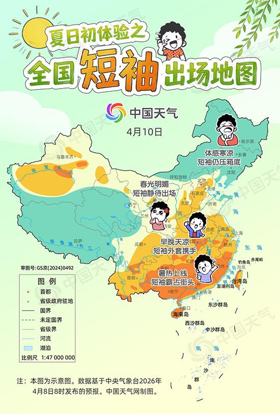 其中9日,华南大部暑热持续,海南等地还会有高温出没,短袖稳稳霸占街头;江南部分地区暖热升级,湖南、江西、浙江等地最高气温将冲上30℃,杭州、南昌等城市将现今年首个30℃+,短袖也可以出场了。四川盆地、湖北、陕西中南部、山西南部、河南西部、安徽南部、江苏南部白天暖意融融,但早晚仍然天凉,可采用洋葱式穿衣法,短袖外套携手。东北、华北北部、青藏高原等地体感寒凉,需厚外套护体,短袖仍压箱底。