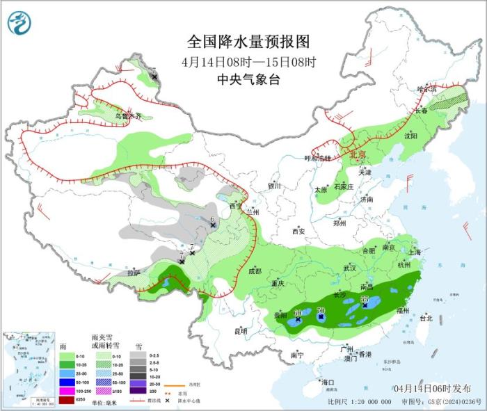 4月14日08时至15日08时,新疆北疆东部和南疆盆地、西藏东南部、青海大部、甘肃河西和南部、川西高原北部、黑龙江东南部、吉林东部等地部分地区有小到中雪或雨夹雪,其中,新疆北疆东部、西藏东北部、青海东南部等地部分地区有大雪(5~7毫米);江南中南部、贵州东南部、广西东北部、广东西北部、西藏东南部等地部分地区有中到大雨,其中,贵州东南部、湖南南部、江西中部、广西东北部等地局地有暴雨(50~70毫米)。内蒙古中东部、新疆北疆北部和沿天山地区、西藏南部和西部、山东半岛等地部分地区有4~6级风;北部湾有5~6级风、阵风7级。