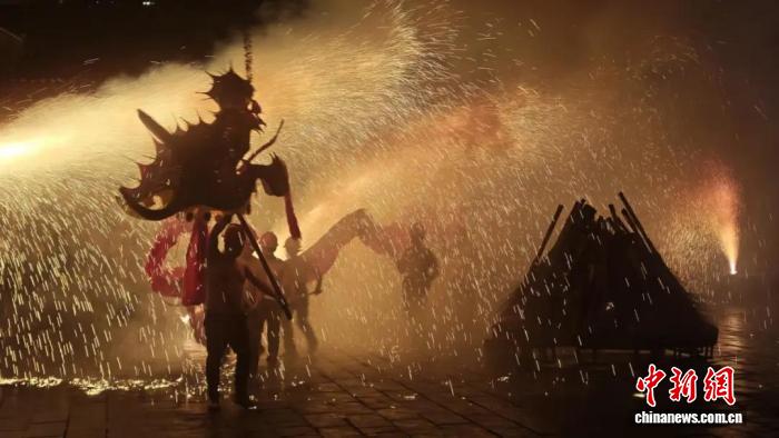 压轴的是来自湘西马颈坳镇、有300年历史的“钢火烧龙”。赤膊的汉子舞动火龙,火花四溅,照亮峡谷夜空。篝火腾空,各族同胞手拉手围成同心圆,和舞龙队一起跳了起来。