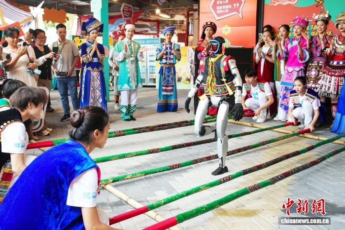 非遗打卡点人气爆棚。竹竿舞表演中,机器人进退自如、节奏精准,与民众一起欢快蹦跶,“嗨”翻全场。美食体验区里,机器人和真人共同打油茶——捶打、翻炒、熬煮,动作同步,茶香四溢。
