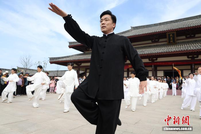 中新网山东邹城4月19日电(周艺伟)4月19日,农历三月初三上巳节,丙午年纪念伏羲女娲活动在山东省邹城市郭里镇伏羲文化产业园举行。现场,刚柔并济、古韵十足的伏羲拳表演完毕后,各界人士敬献花篮、拜谒先祖、鸣钟祈福,共同追思伏羲“一画开天”的创世功绩,赓续中华民族的文化根脉。