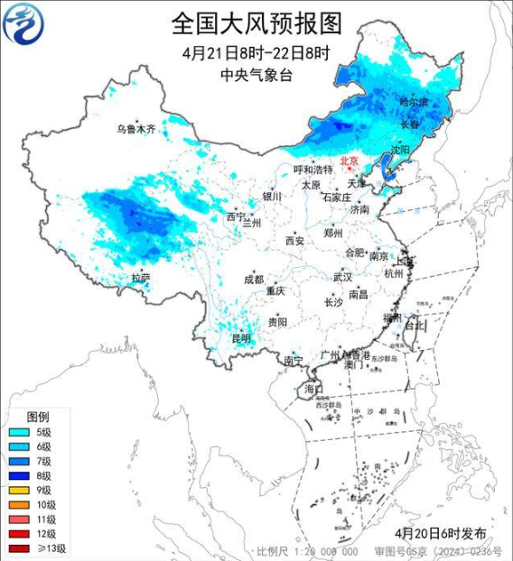 预计,4月20日08时至21日08时,新疆沿天山地区和南疆盆地、西藏大部、青海大部、甘肃河西、内蒙古中东部、东北地区大部、河北北部、北京、天津、山东半岛、苏皖大部、湖北东部等地部分地区有5~7级风,阵风8~9级,其中新疆东部山口、西藏北部、内蒙古中部局地有8~9级风,阵风10级以上;渤海、渤海海峡、黄海北部海域、黄海中西部和西南部部分海域将有7~8级、阵风9级的大风。