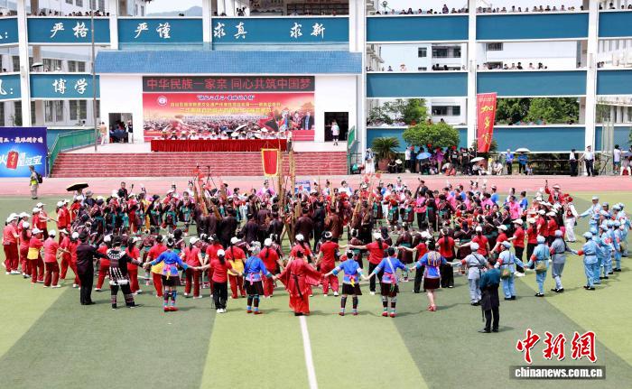 文艺展演环节,龙狮队欢腾献瑞,芦笙队歌舞翩翩,各族民众手牵手欢跳多耶,将现场气氛推向高潮。