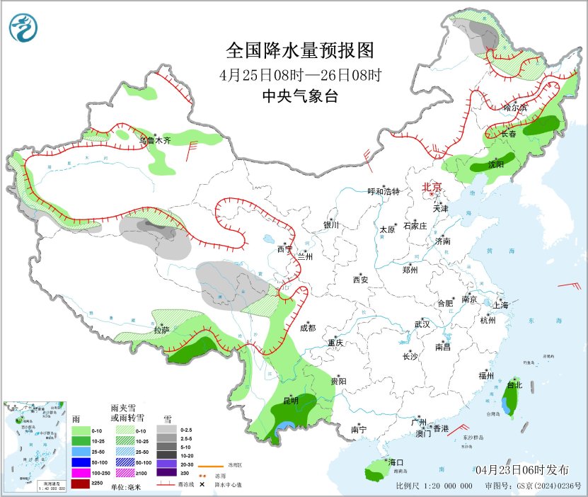 4月25日08时至26日08时,内蒙古东北部、黑龙江西北部、新疆南疆西部山区、青海西部和东南部、西藏中部、川西高原北部等地部分地区有小到中雪或雨夹雪;东北地区中南部、西藏东南部、云南、海南岛、台湾岛等地部分地区有小到中雨,局地有大雨。内蒙古中部、新疆东部等地部分地区有4~6级风。