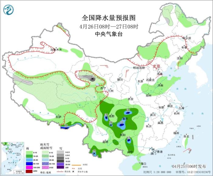 4月26日08时至27日08时,内蒙古东北部、黑龙江西北部、新疆南疆南部山区、西藏北部、青海大部、甘肃祁连山区等地部分地区有小到中雪或雨夹雪,其中,青海北部等地部分地区有大雪(5~6毫米);四川中东部、重庆、湖北西部、湖南西部、贵州、云南东部和南部、广西中部、西藏东南部等地部分地区有中到大雨,其中,西藏东南部、四川盆地西南部、重庆北部、贵州西北部、广西西北部等地部分地区有暴雨(50~80毫米)。内蒙古中西部、河北北部和东部、辽东半岛等地部分地区有4~6级风。