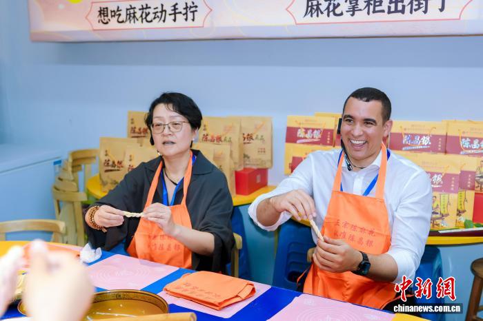 古镇牌坊下,高桩舞狮伴着铿锵锣鼓与嘹亮唢呐热闹展演,引得外交官们驻足记录;沙磁乱针绣工坊里,绣娘以针为笔、以线为墨,绣出如油画般细腻的质感,让众人近距离领略非遗技艺的精妙;在陈麻花传统制作体验区,外交官们挽起袖子,跟着非遗代表性传承人体验揉面、搓条、拧花的全流程,举着自己的手工“作品”合影留念。