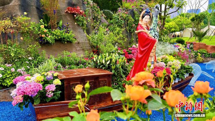 襄阳园中,“古城墙”复刻襄阳古城的雄浑轮廓,蓝白相间的“波浪”勾勒汉江的灵动;黄冈园中,苏轼雕像衣袂翩然,多彩杜鹃绽放,一展“杜鹃花城”美名;孝感园中,董永与七仙女的雕像立于花丛,定格“孝爱之城、甜蜜之地”……