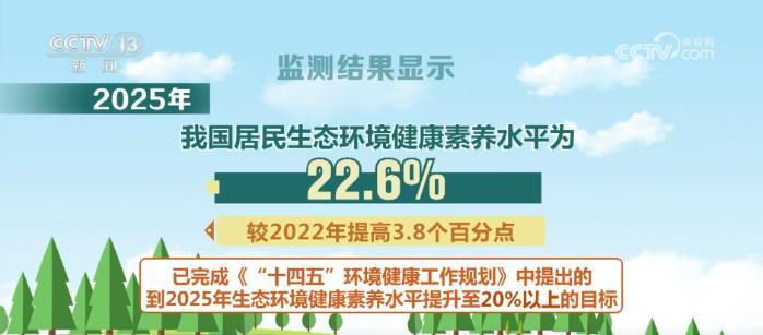 监测结果显示,2025年我国居民生态环境健康素养水平为22.6%,较2022年提高3.8个百分点,已完成《“十四五”环境健康工作规划》中提出的到2025年生态环境健康素养水平提升至20%以上的目标。