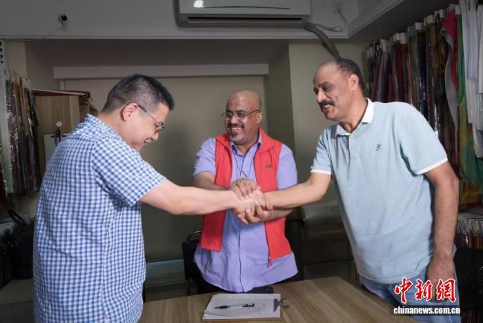同样深谙此道的还有来自也门的“洋娘舅”安特尔(Antar)。安特尔在柯桥做纺织生意20余年,能说一口流利的中文。一次,中外布商因面料色差问题僵持不下,安特尔主动出面调解。涉外调解室内,安特尔拍拍两人的肩膀,示意其先坐下来。