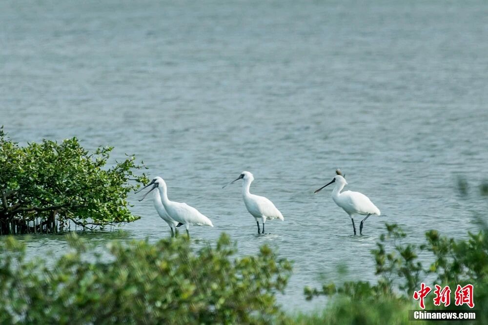从山间归来,四必湾3000多亩红树林湿地间,黑脸琵鹭悠然伫立。
