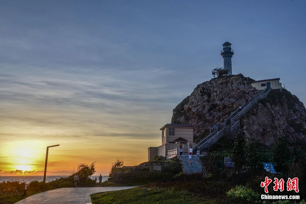鱼鳞洲上,一座白色灯塔矗立于岩石小山。傍晚时分,夕阳把海面染成橘子汽水色,海浪拍打着褐色的礁石,远处的巨大风车缓缓转动。