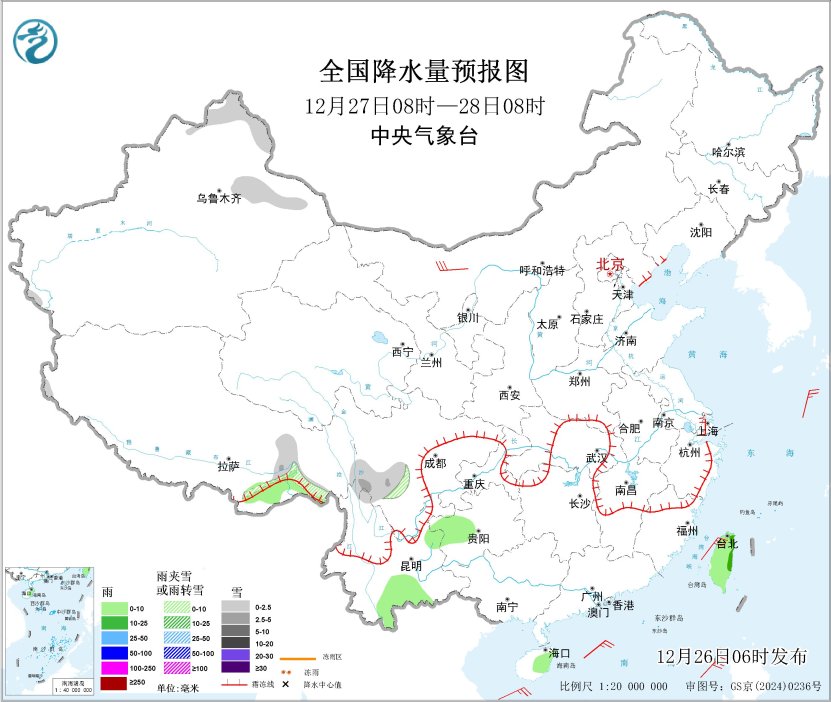 12月26日08时至27日08时,新疆南疆西部山区和北部、西藏北部和西部等地部分地区有小雪或雨夹雪,其中,新疆北疆北部高海拔地区有中到大雪,局地暴雪(10~12毫米)。西藏南部、四川东部和南部、云南东北部和南部、海南岛中部、台湾岛等地部分地区有小雨,其中,台湾岛东部部分地区有中雨。新疆沿天山地区、西藏北部、青海南部等地部分地区有5~6级风;东部和南部海域有7~8级风,阵风9级。