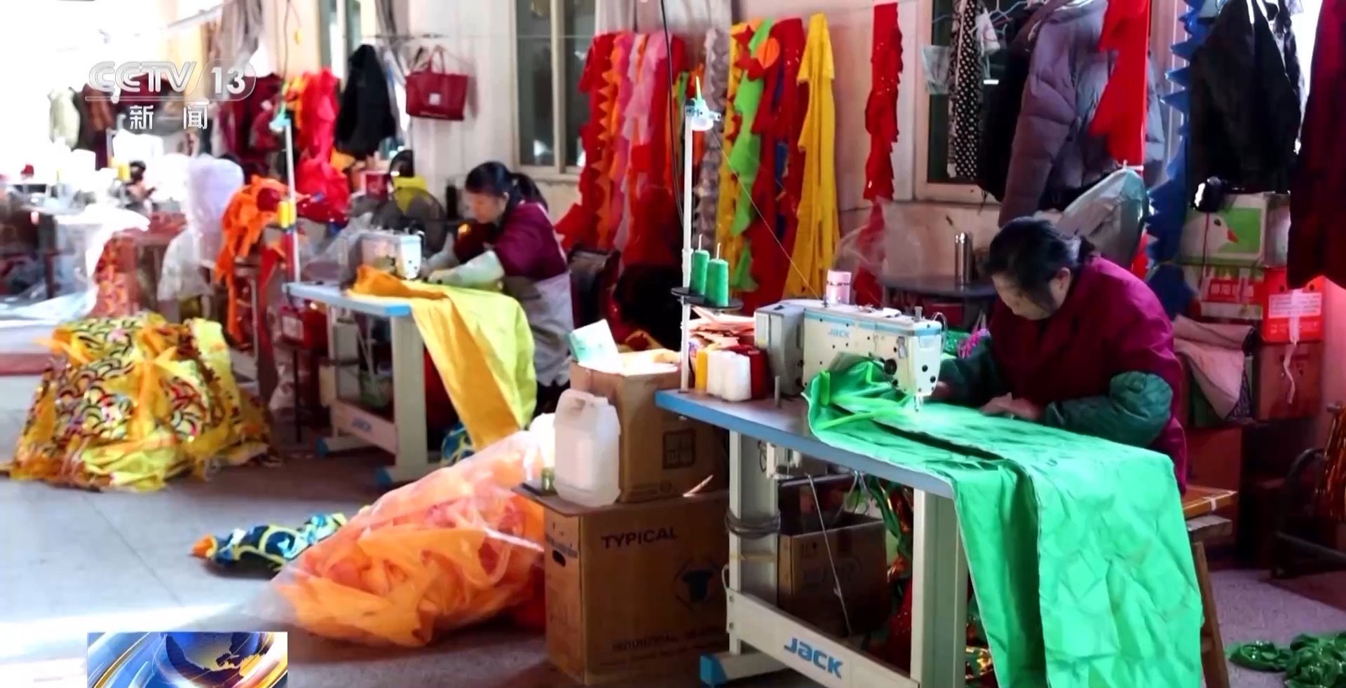 在龙灯生产基地,工人们正忙着扎龙头、糊龙身、缝龙鳞,全力赶制订单。工作人员介绍,这里平均每天要生产30多条龙灯成品,发往全国各地及海外。