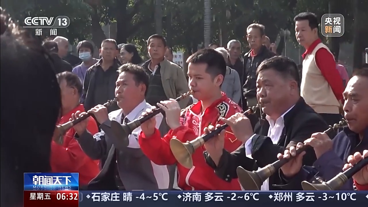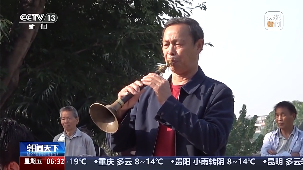 一早,在广西玉林市的清湾江公园里,八音演奏已经开始,吸引了不少市民驻足欣赏,还有人不禁跟着演奏打起了节拍。