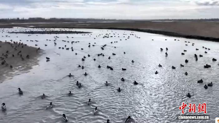 中新网新疆和田12月26日电 (陶拴科 乌卜力·阿西木)进入12月下旬,冬日的新疆墨玉县喀瓦克乡南坪水库旁,成为国家级保护鸟类的栖息乐园。绿头鸭和灰雁成群嬉戏追逐,灰鹤则悠然在冰面漫步、稻田觅食,生动展现了一幅人与自然和谐共生的美丽画卷。